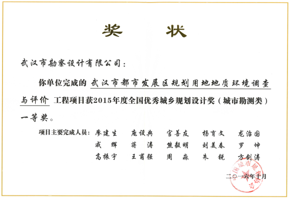 武漢市都市發(fā)展區(qū)規(guī)劃用地地質(zhì)環(huán)境調(diào)查與評(píng)價(jià)獲2015年度全國(guó)優(yōu)秀