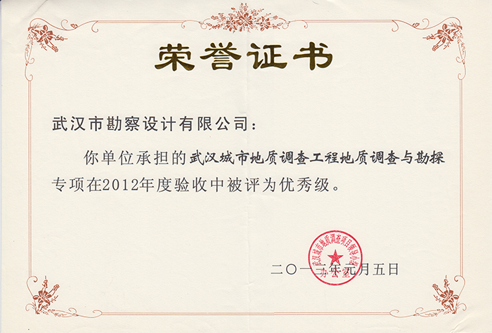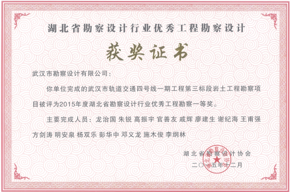 武漢市軌道交通四號(hào)線一期工程第三標(biāo)段巖土工程勘察項(xiàng)目獲2015年