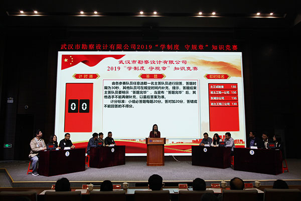 為進(jìn)一步加強(qiáng)員工對公司企業(yè)文化及各項(xiàng)規(guī)章制度的學(xué)習(xí)和認(rèn)識,提高員工的綜合素養(yǎng),10月30日上午,公司首次舉辦的2019年度“學(xué)制度 守規(guī)章”知識競賽活動在測繪院307學(xué)術(shù)報(bào)告廳成功舉辦。公司董事長廖建生,總經(jīng)理施木俊,副總經(jīng)理安永強(qiáng)、官善友、蔣濤,代理副總經(jīng)理熊劍,代理總會計(jì)師龔瑋親臨現(xiàn)場指導(dǎo)并觀看了比賽,公司各部門負(fù)責(zé)人及員工代表共計(jì)100余人參加了活動。巖土工程一公司、巖土工程二公司、測繪工程公司、基礎(chǔ)工程公司、檢測監(jiān)測公司、設(shè)計(jì)中心、地質(zhì)環(huán)境中心、不動產(chǎn)咨詢中心、東湖分公司、新區(qū)分公司、臨空分公司、土工試驗(yàn)室等12支生產(chǎn)部門代表隊(duì)共36名選手參加了此次比賽。