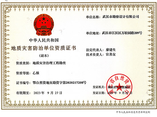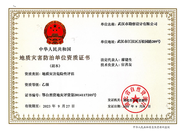 2020年9月28日,公司地質(zhì)災(zāi)害危險(xiǎn)性評(píng)估、勘查、設(shè)計(jì)丙級(jí)升乙級(jí)資質(zhì)申報(bào)材料順利通過湖北省自然資源廳審核,并取得了地質(zhì)災(zāi)害危險(xiǎn)性評(píng)估、地質(zhì)災(zāi)害治理工程勘查、地質(zhì)災(zāi)害治理工程設(shè)計(jì)乙級(jí)資質(zhì)證書,為公司今后能夠順利承接各類中小型地質(zhì)災(zāi)害危險(xiǎn)性評(píng)估、勘查、設(shè)計(jì)業(yè)務(wù)等提供了更有力的保障。