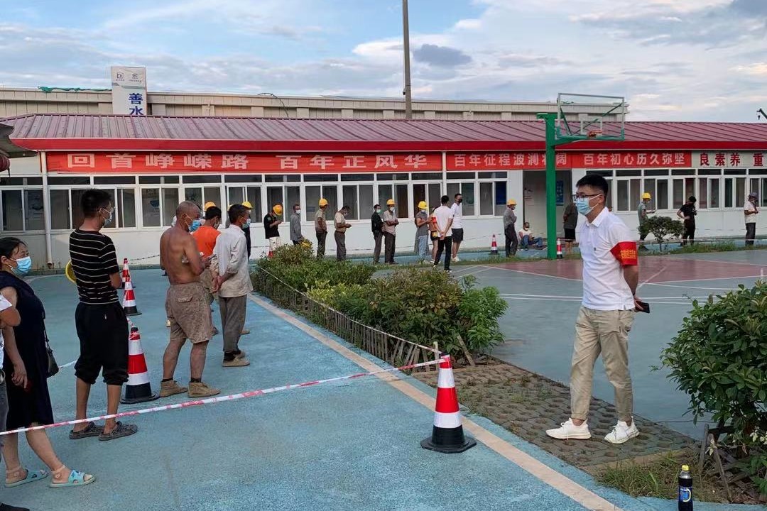 8月5日晚上18:00,公司黨員杜徐峰、宋友建、鄭暉、梅冬、余斌、陳澤風(fēng)、李子紅在社區(qū)工作調(diào)度下,來到黃家湖污水廠核酸檢測點,協(xié)助做好核酸檢測工作。面對炎熱夏夜和蚊蟲叮咬,黨員們依然堅守在檢測現(xiàn)場,熱情耐心地為該項目現(xiàn)場共計200余名工人,進行信息登記、掃碼、維持現(xiàn)場秩序、講解檢測流程等,工作直至凌晨12點才結(jié)束。“我們處于與病毒賽跑的關(guān)鍵時刻,作為黨員,我們義不容辭要為這場戰(zhàn)斗添油助力!”黨員們紛紛表示道。