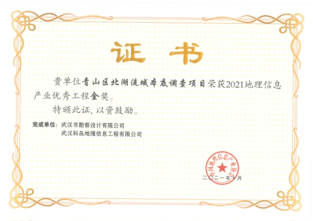 公司實(shí)施的“武漢市中心城區(qū)排水管網(wǎng)隱患排查項(xiàng)目”及“青山區(qū)北湖流域本底調(diào)查項(xiàng)目”憑借著先進(jìn)的技術(shù)手段、優(yōu)良的數(shù)據(jù)成果及多項(xiàng)專利發(fā)明獲得了“2021年地理信息產(chǎn)業(yè)優(yōu)秀工程金獎(jiǎng)”。