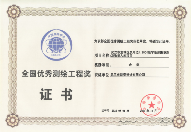 “武漢市主城區(qū)及周邊1:2000數(shù)字地形圖更新及數(shù)據(jù)入庫(kù)項(xiàng)目”榮獲2021年中國(guó)測(cè)繪學(xué)會(huì)全國(guó)優(yōu)秀測(cè)繪工程獎(jiǎng)金獎(jiǎng)