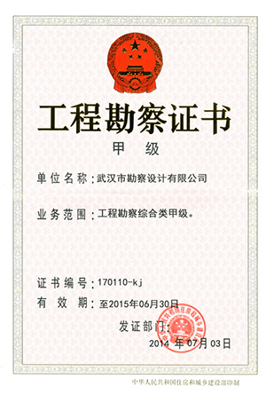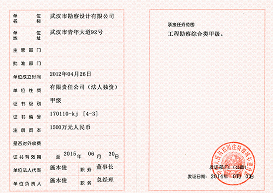 在我院領導的指導關(guān)心下,經(jīng)過管理部門長久以來的大力支持以及全院相關(guān)人員的協(xié)作和努力,7月3日,我院勘察公司喜獲國家住建部頒發(fā)的工程勘察綜合類甲級資質(zhì)證書。