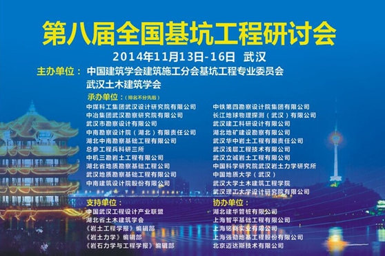 2014年11月14日,第八屆全國(guó)基坑工程研討會(huì)在武漢市洪山賓館隆重召開(kāi)。此研討會(huì)每?jī)赡昱e辦一次,是國(guó)內(nèi)基坑工程技術(shù)專業(yè)的頂級(jí)交流活動(dòng)。本次大會(huì)共有來(lái)自全國(guó)各地的行業(yè)精英700余人參加,并邀請(qǐng)到龔曉南、劉祖德、范士凱、顧金才、黃強(qiáng)、唐雨耕、宋二祥、鄭剛、王衛(wèi)東、徐武建、彭浩、張曠成等工程院院士、全國(guó)頂尖大師、知名學(xué)者及重要領(lǐng)導(dǎo)作為與會(huì)嘉賓,大家齊聚一堂,共襄盛會(huì)。