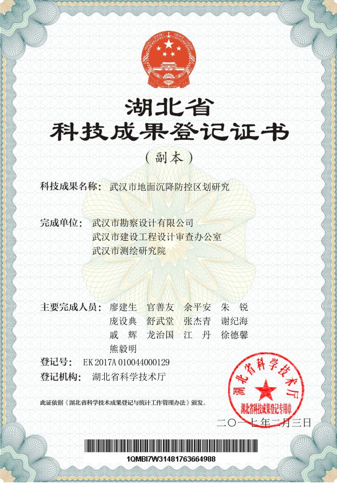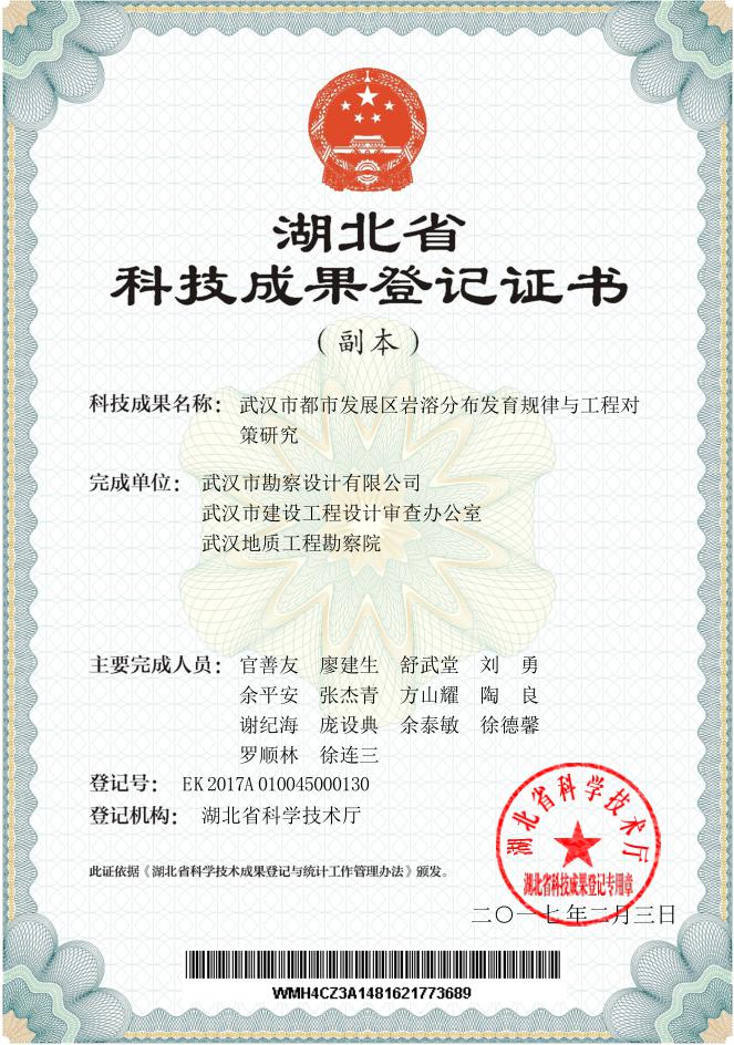 勘察公司作為地質(zhì)災(zāi)害防治領(lǐng)域的技術(shù)咨詢服務(wù)公司,在市規(guī)劃局和城建委的領(lǐng)導(dǎo)和指示下,迅速組成以廖建生董事長兼總經(jīng)理、官善友副總經(jīng)理兼總工程師為核心的創(chuàng)新團(tuán)隊(duì),開展地質(zhì)災(zāi)害防治技術(shù)和科學(xué)研究。經(jīng)過數(shù)年的深入解析和潛心鉆研,率先取得了地質(zhì)災(zāi)害防治領(lǐng)域國內(nèi)領(lǐng)先的科技成果:主持的科研項(xiàng)目《武漢市都市發(fā)展區(qū)巖溶分布發(fā)育規(guī)律與工程對策研究》和《武漢市地面沉降防控區(qū)域研究》通過了湖北省科技廳組織的科技成果鑒定,鑒定專家委員會一致認(rèn)為項(xiàng)目研究成果總體達(dá)到國內(nèi)領(lǐng)先水平,由省科技廳頒予《湖北省科技成果登記證書》。為武漢市地質(zhì)災(zāi)害防治和地質(zhì)環(huán)境保護(hù)提供了科學(xué)精準(zhǔn)的基礎(chǔ)資料、技術(shù)措施和應(yīng)用成果,為武漢市生態(tài)城市建設(shè)充分發(fā)揮出了人才、技術(shù)和科技優(yōu)勢。