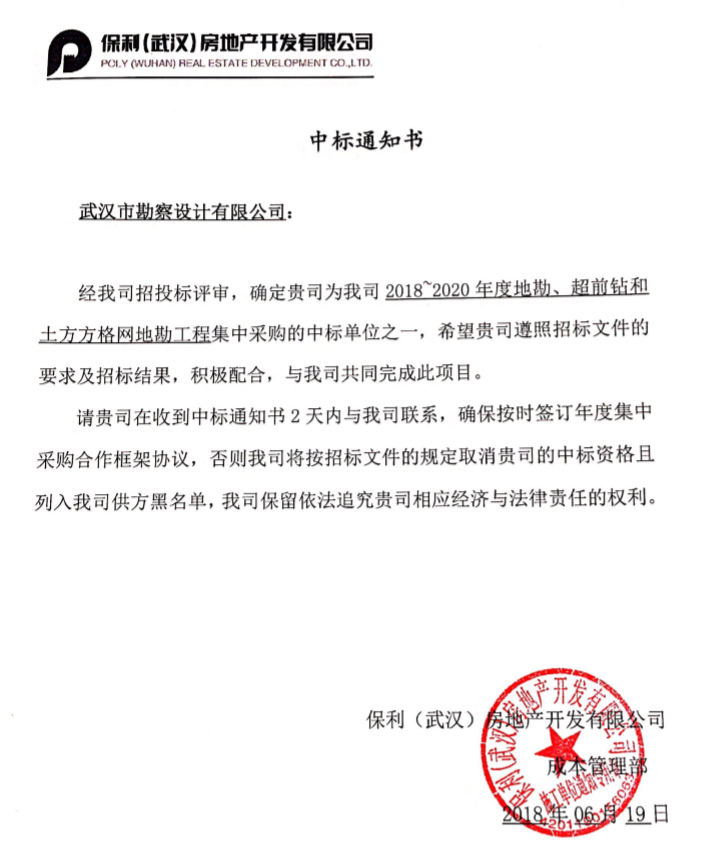 經(jīng)招投標(biāo)評(píng)審,我司被確定為保利(武漢)房地產(chǎn)開發(fā)有限公司2018-2020年度地勘、超前鉆和土方方格網(wǎng)地勘工程集中采購(gòu)項(xiàng)目的中標(biāo)單位之一。本次項(xiàng)目的中標(biāo)是我司與保利地產(chǎn)武漢公司的又一次密切合作。