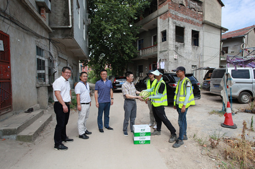 2018年入夏以來,武漢出現(xiàn)持續(xù)40℃以上的高溫天氣,室外地表溫度普遍達到60度以上。高溫酷暑下,我公司分布在全市各區(qū)域的項目部工作人員依然奮戰(zhàn)在項目施工現(xiàn)場的第一線,他們搶抓施工黃金季,揮汗如雨,確保各項工程的安全、優(yōu)質(zhì)、高效。公司領(lǐng)導高度重視,董事長廖建生親自部署,要求各部門及時安排防暑降溫物資,注重安全生產(chǎn),同時指示公司領(lǐng)導立即分赴項目現(xiàn)場慰問指導,察看施工作業(yè)情況,解決實際困難。